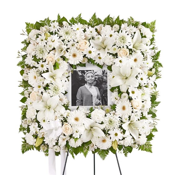 Offer solace with a sentimental arrangement for the services. Our square wreath features soothing white blooms and greenery for a lush, full presentation. A photo can be displayed in the center, creating a unique and beautiful tribute to a cherished loved one. Standing spray arrangement features a stylized 18" square wreath with white roses, Asiatic lilies, Peruvian lilies (alstroemeria) Gerbera daisies, mums, daisy poms, button poms, carnations and limonium; accented with assorted greenery and white satin ribbon Measures approximately 31"H x 31"W without stand Arrives on an easel; measures 66"H Appropriate for the funeral home or gravesite Our florists hand-design each arrangement, so colors and varieties may vary due to local availability To ensure lasting beauty, Asiatic and Peruvian lilies may arrive in bud form and will fully bloom over the next few days